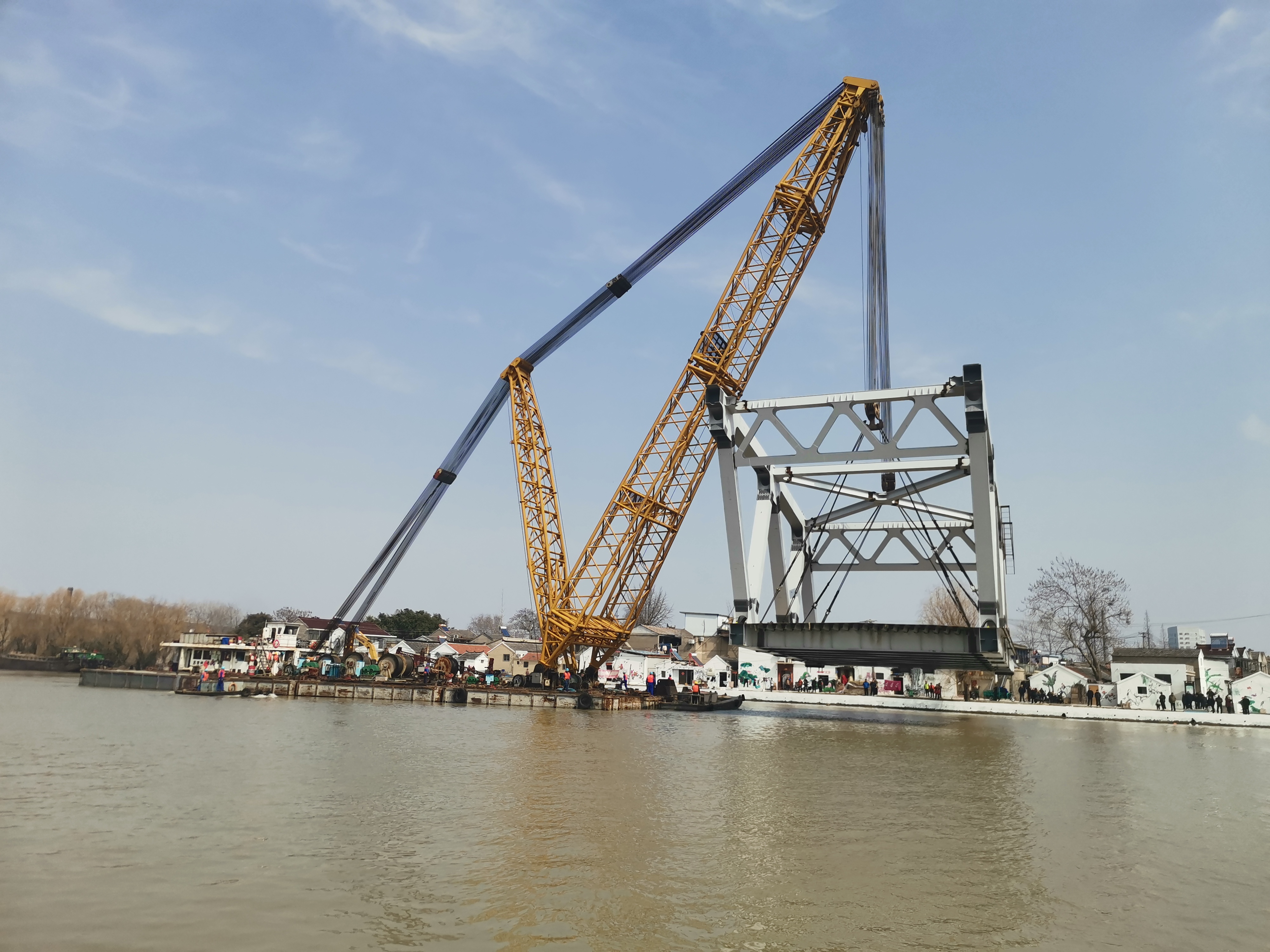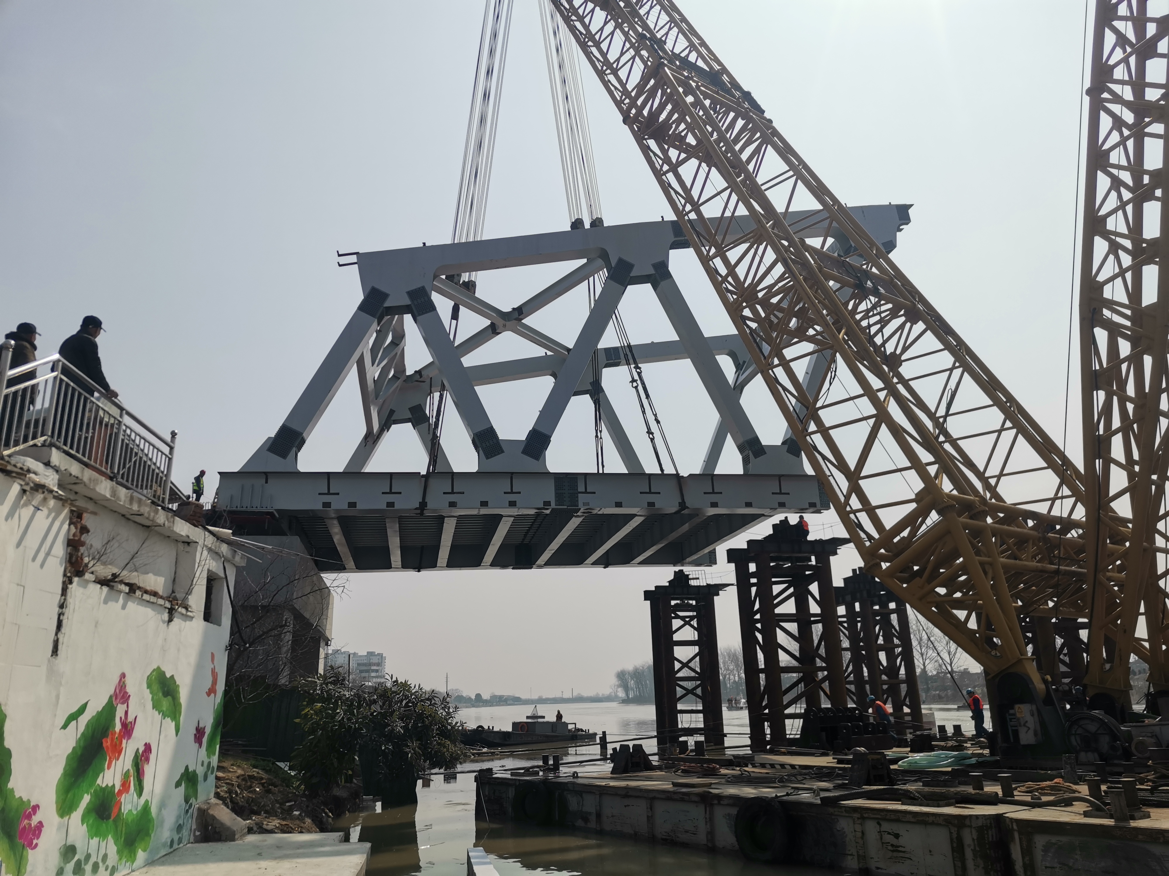 3月3日,京杭大運(yùn)河兩岸人頭攢動(dòng),在全體參建人員的奮戰(zhàn)拼搏下,由江蘇交工承建的蘇北運(yùn)河最大跨度拱形鋼桁架橋梁——揚(yáng)州寶應(yīng)運(yùn)河大橋主跨135米鋼桁梁首節(jié)成功架設(shè),標(biāo)志著該項(xiàng)目進(jìn)入鋼桁梁吊裝階段,主跨貫通勝利在望。